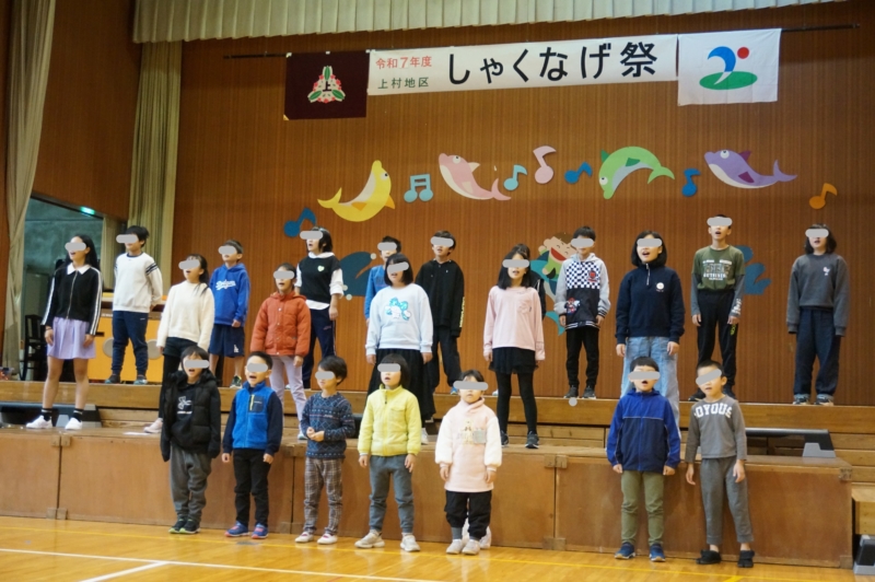 11月9日(日)にしゃくなげ祭が行われました。しゃくなげ祭は、上村地区の文化祭ですが、小学校の音楽会も一緒に行います。会場の小学校体育館には、小学生や地域の方の作品が展示されたり、各種団体の活動を紹介したり体験をしたりするブースが設けられたりしました。ステージ発表は、小学生の合唱発表のほか、保育園の歌やダンスの発表、有志発表、ゲストアーティスト「かほくわち」さんのミニコンサートなど会場一帯で音楽を楽しみました。音楽発表の最後には、下栗シニアクラブの発表がありました。皆さんもどこかで耳にしている『里の秋』の歌詞には戦争で出兵している家族を思う歌詞があり、シニアクラブの皆さんが平和を願って歌ってっくださいました。その思いを受け、上村小の全校で『平和の鐘』をサプライズで合唱しました。