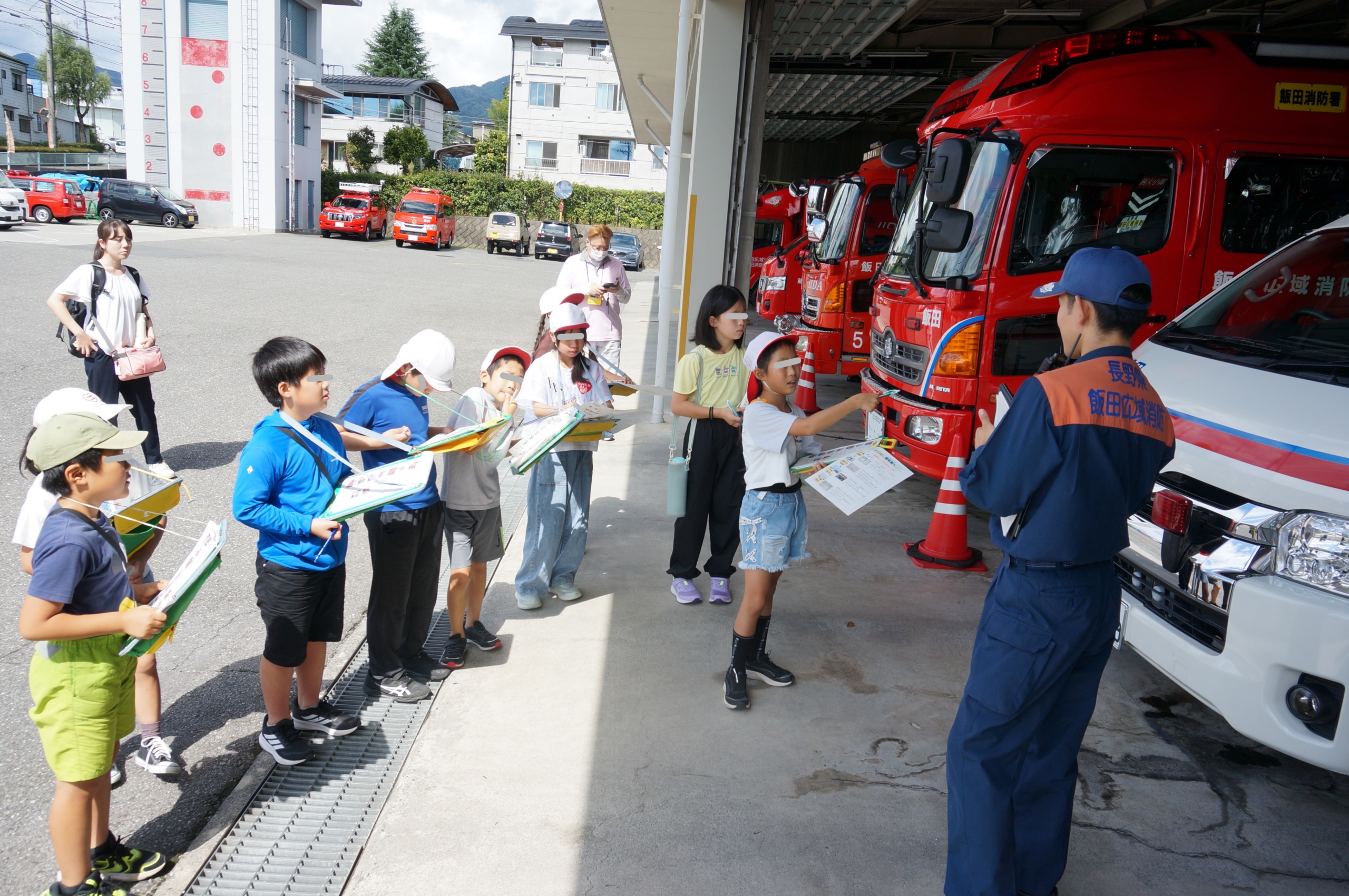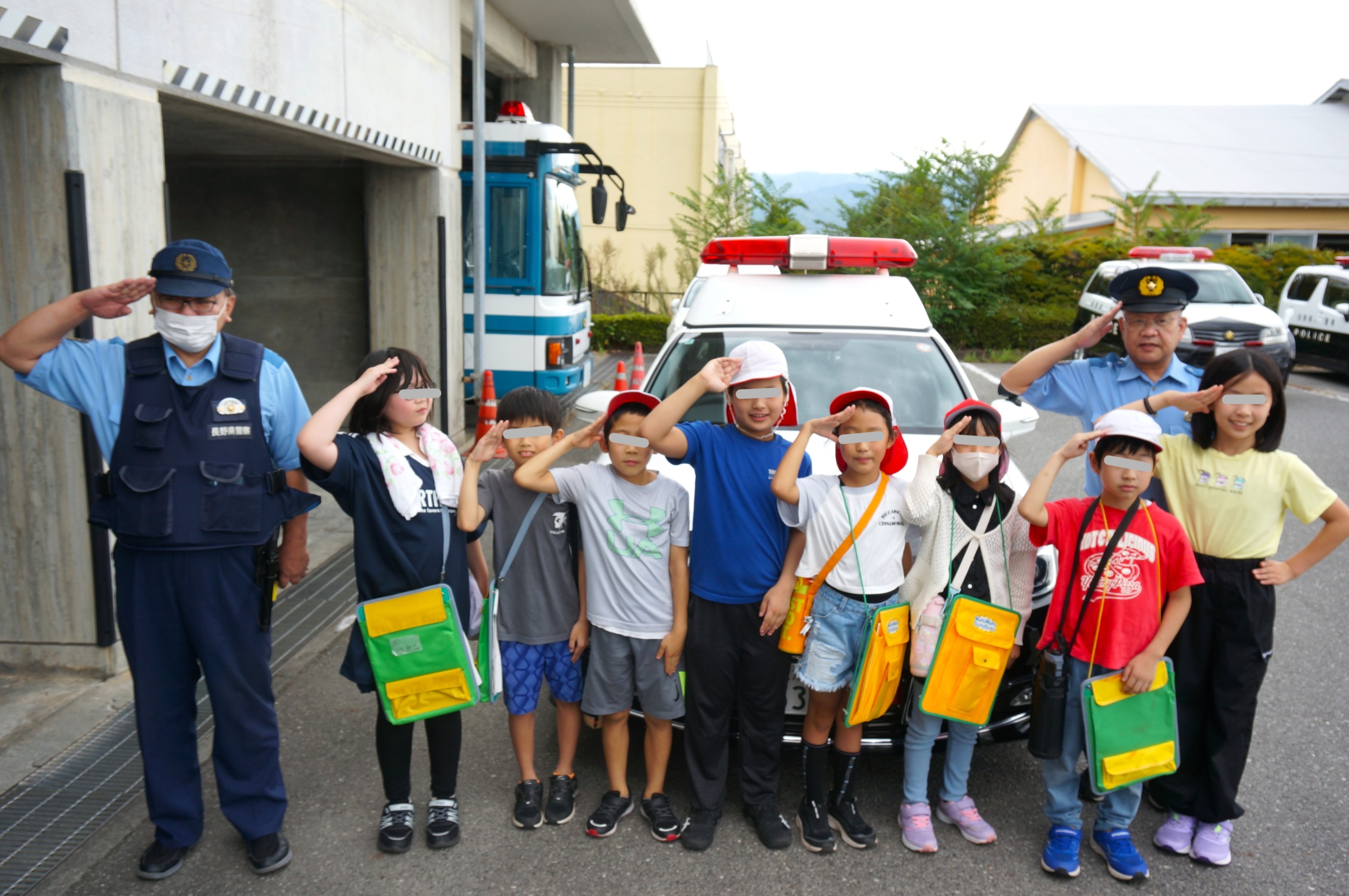 9月19日(金)に、3・4年生が、和田小学校と合同で、飯田消防署と飯田警察署に社会見学に行ってきました。消防署では、司令室や消防車の見学や消防服を着て放水をする体験などもさせていただきました。社会科の単元内自由進度学習の学びとも合わせ、自らの問いを追究する姿が見られました。警察署での防犯のお話とも合わせ、わたしたちのくらしを守る仕事について学ぶことができました。