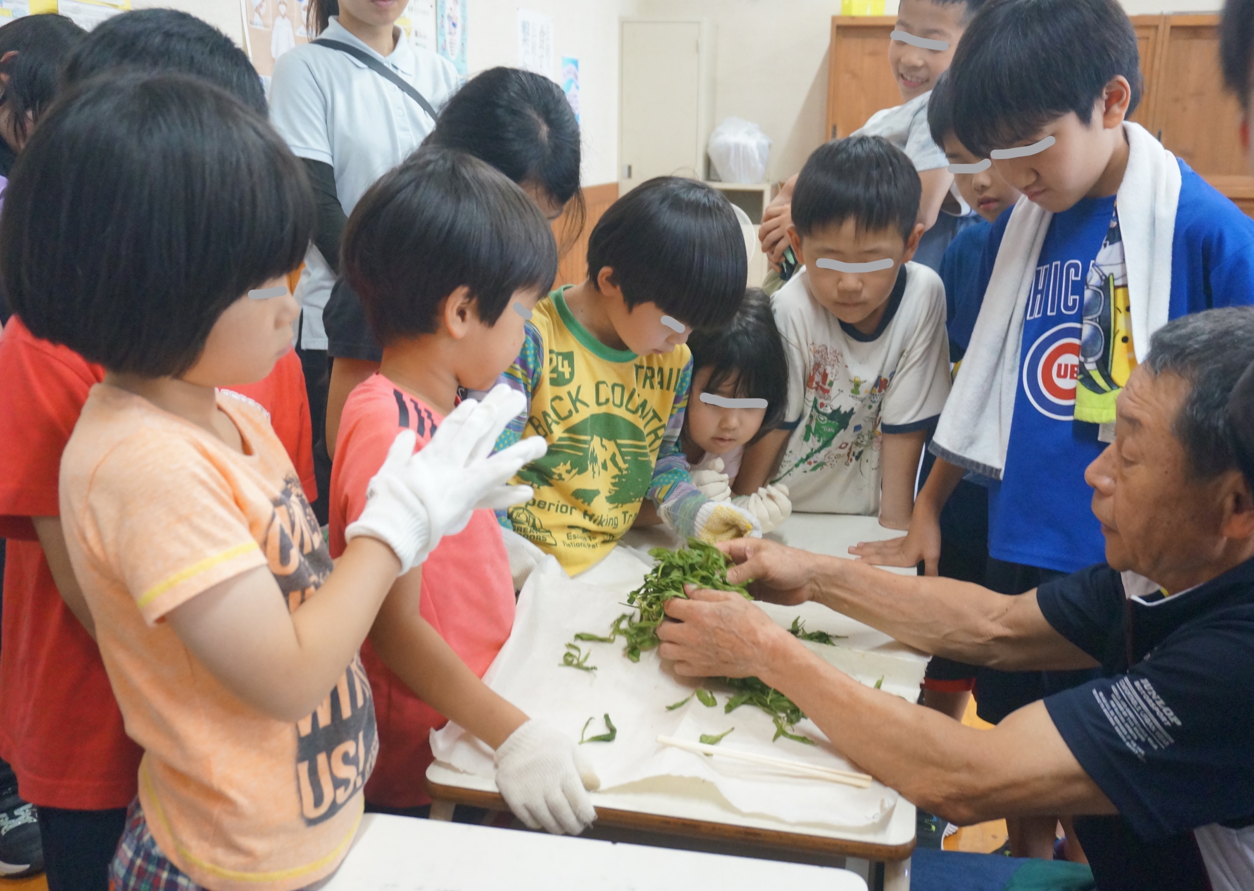 7月15日は、お茶摘みの予定でしたが、あいにくの雨降りのため中止。お茶づくりの指導者岡井さんが前日に摘んでくださった新茶の葉をつかって、手もみ茶を教えていただき、風味豊かな遠山郷の新茶を全校でいただきました。