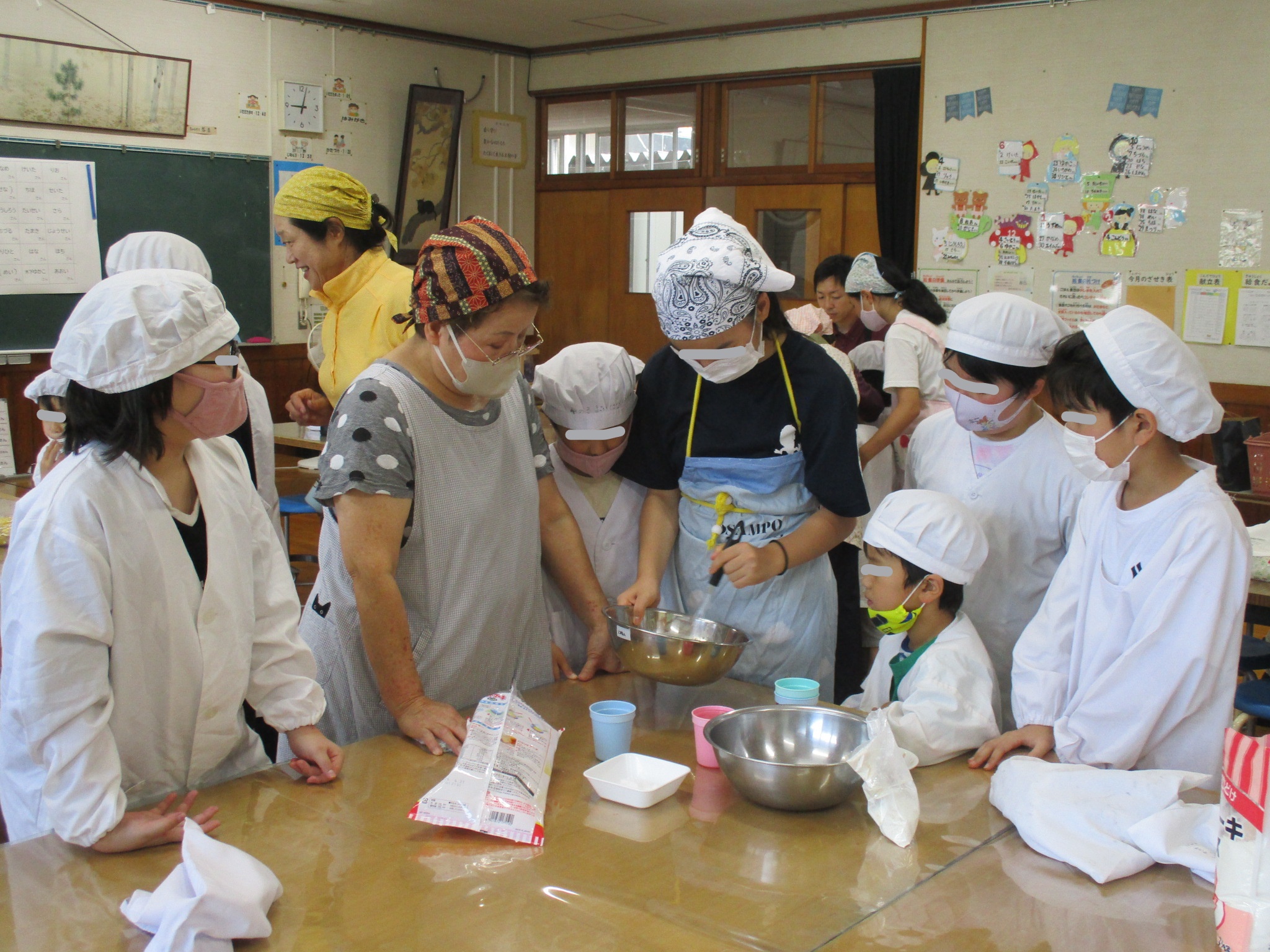7月7日には、地域の食育改善委員会の皆さんに来ていただき、全校でクレープ作りを行いました。協力してつくったクレープに地元産のブルーベリーなどをはさんでおいしくいただきました。