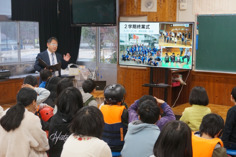 12月24日(水)に2学期終業式を行いました。1・2年生は、音楽の時間に学習した鍵盤ハーモニカと鉄琴で『キラキラ星』を演奏しました。3・4年生は、総合的な学習の時間で題材としてきた「上村川」の学習の経過を発表しました。校長からは、「自ら学ぶ」「探究する」「楽しいことを考える」「発信する」といった2学期の学びの姿を写真とともに振り返りました。巷で流行っていたインフルエンザの罹患もなく、この日は、全校児童24人が全員顔を揃えることができました。全員で元気よく校歌を歌いました。健康で1年を終えることができたのも、霜月祭でお呼びした神様のおかげでしょうか? 3学期始業式は、1月7日(水)です。また、元気に会いましょう。