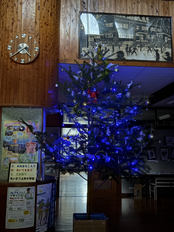 玄関には、畑作りなどでお世話になっている近所の岡井さんにつくっていただいた門松が飾られています。玄関を入ると用務員の梶間さんが用意してくれた大きなモミの木のクリスマスツリーが、終業式の日まで飾られていました。今年も、たくさんの方々が子どもたちの笑顔のために協力してくださいました。「おかげさま」の気持ちを忘れずに、「ありがとう」の言葉を伝えていきたいです。皆様にとって、新しい年がよい1年でありますように。